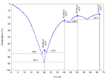 如下圖所示,鹽酸共有四個(gè)結(jié)晶的共熔點(diǎn),分別對(duì)應(yīng)四種晶體:68%(HCl的質(zhì)量分?jǐn)?shù),下同)時(shí)的HCl·H2O、51%時(shí)的HCl·2H2O、41%時(shí)的HCl·3H2O和25%時(shí)的HCl·6H2O。另外在24.8%時(shí)還有一種亞穩(wěn)的HCl·3H2O生成。